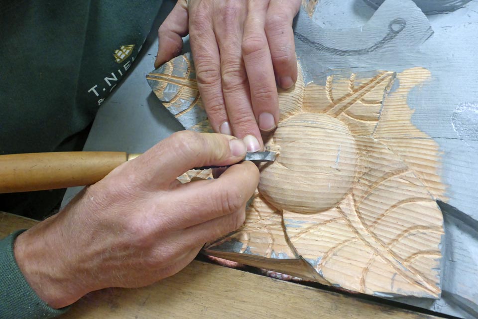A wide variety of chisels and gouges were then used and good knowledge of woodgrain and edge tool sharpening was essential. The figurehead started to take shape with the carving becoming more intricate.